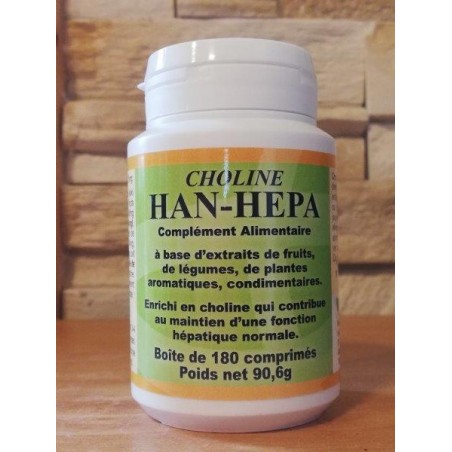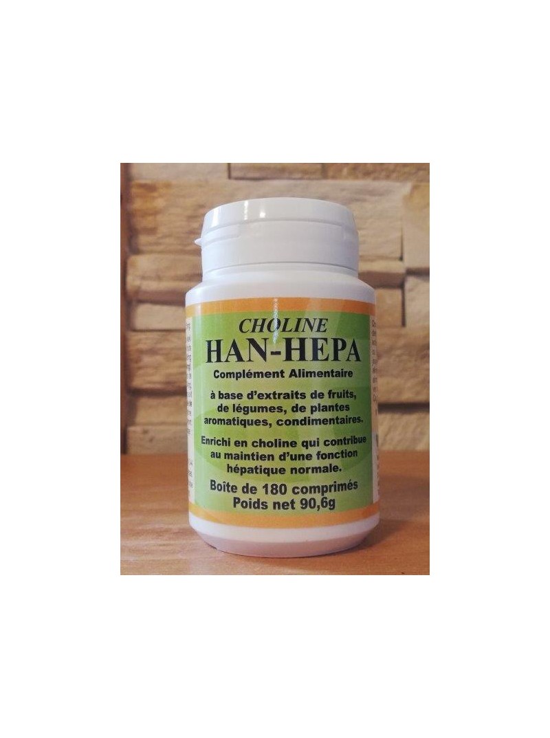 HAN HEPA associe dans un complexe étudié des extraits de fruits, de légumes et de plantes aromatiques et condimentaires bien dotés en polyphénols. Ce complexe est associé à de la choline qui contribue au mainten d'une fonction hépatique normale.