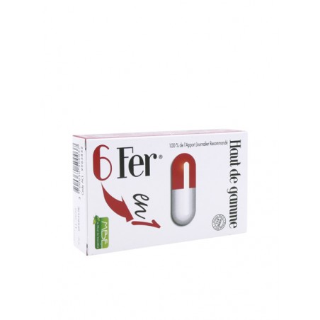 L'association inédite de 6 sources de fer en 1 seule gélule offre une biodisponibilité renforcée grâce à la synergie des sels utilisés, et un apport optimal en fer (100% de l'apport journalier recommandé). Ce complément alimentaire est combiné à la vitamine B9 et à la spiruline. Le fer contribue à la formation normale de l'hémoglobine et des globules rouges, à réduire la fatigue, au fonctionnement normal du système immunitaire, à une fonction cognitive normale et au transport de l'oxygène dans l'organisme.