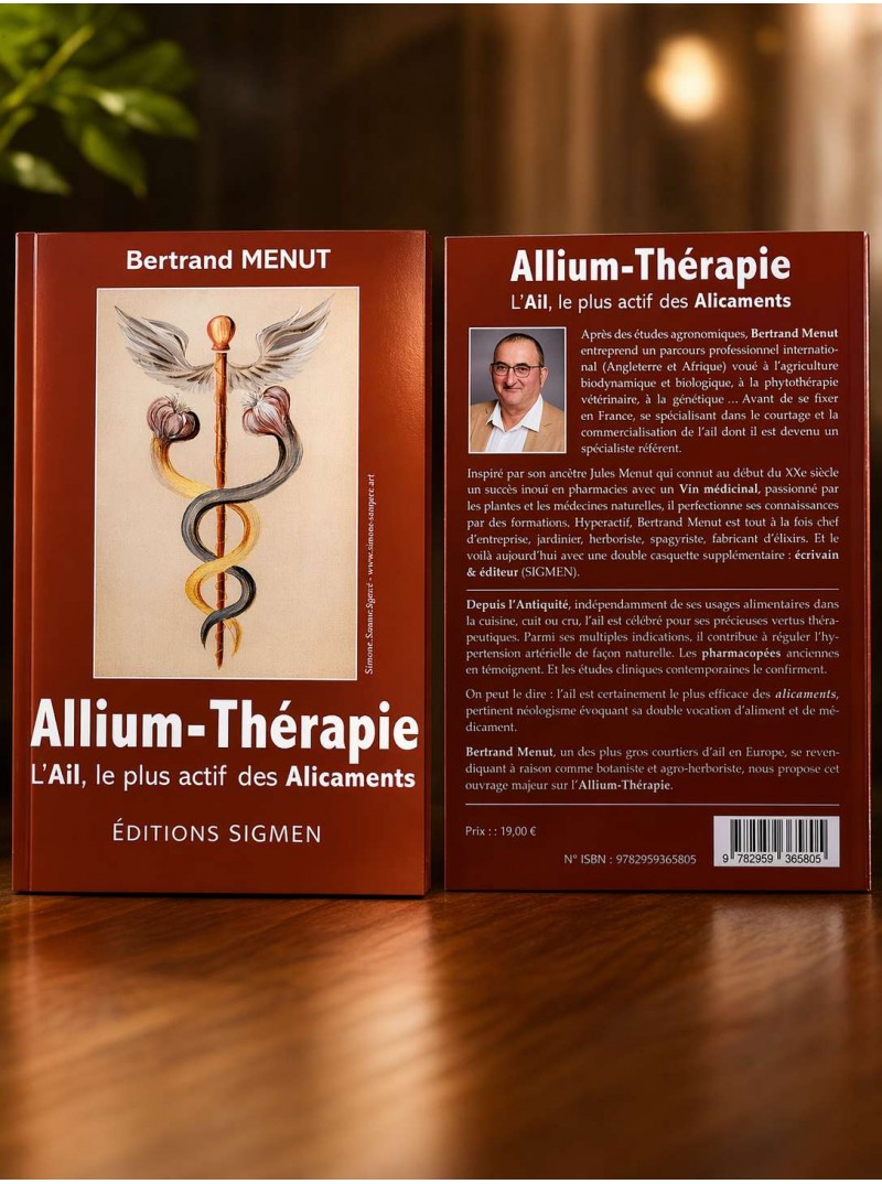 Bertrand MENUT, un des plus gros courtiers d'ail en Europe, se revendiquant, à raison, comme botaniste et agro-herboriste, propose cet ouvrage majeur sur l'Allium-Thérapie.